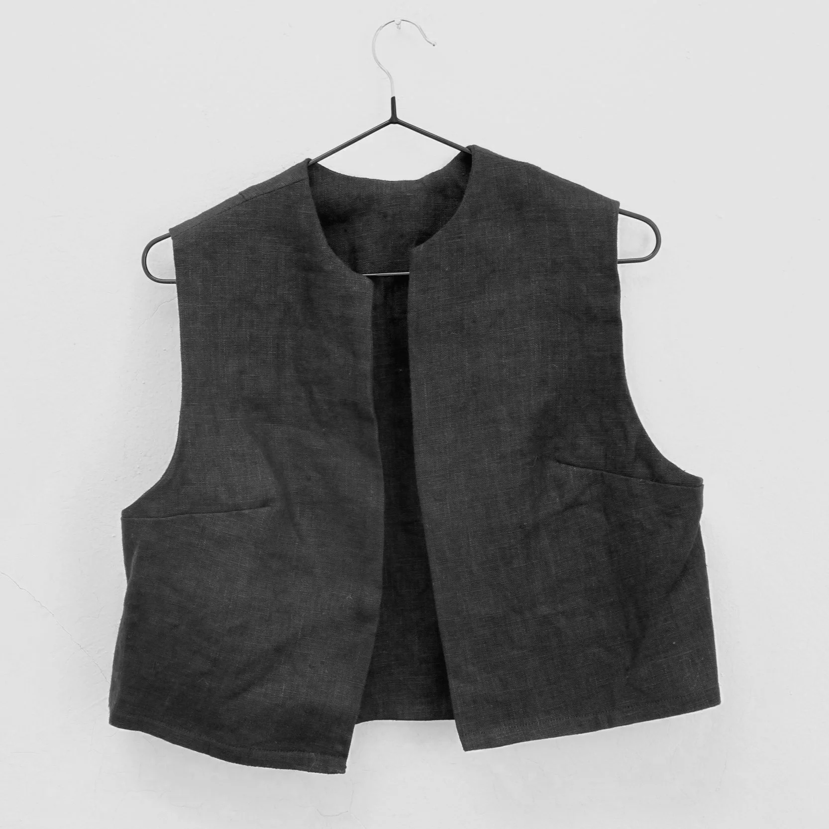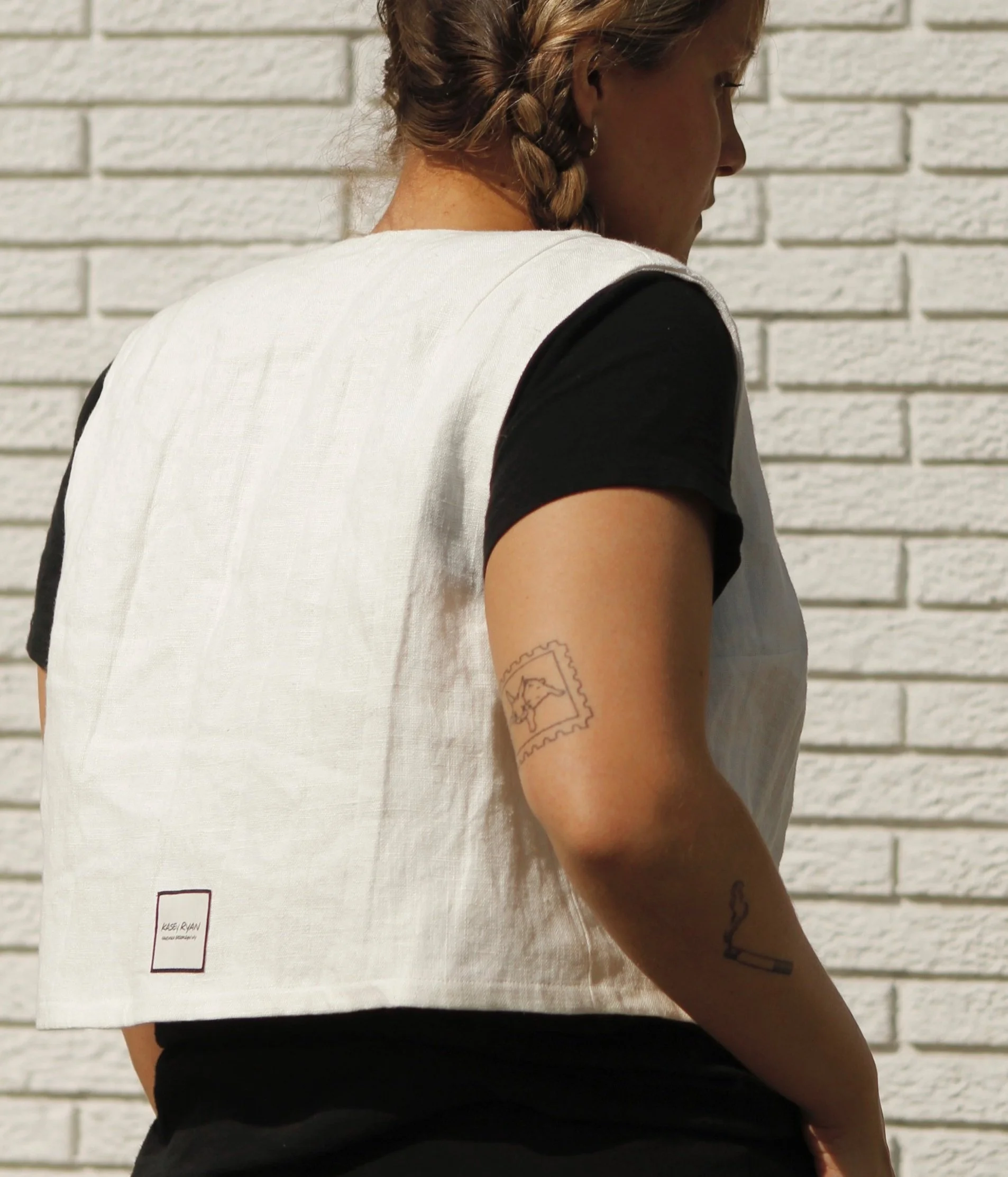 cropped vest - off white linen $175.00 cropped vest - black linen $175.00 cropped vest - white stamped cotton $145.00 tote - natural cotton $68.00 jumpsuit $265.00 long sleeve dress $225.00 mini pocket dress $150.00
